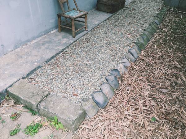 把剩余的石子堆在房前,用瓦片收边。一是为了装饰,二来以后有用的着地方,方便拿来使用。