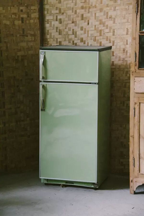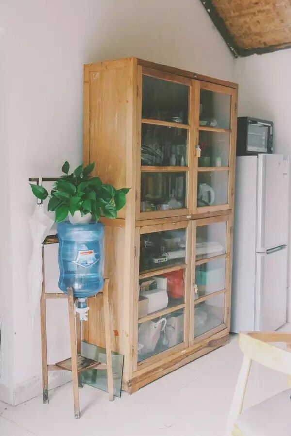 从二手市场收来老木质碗柜和一台保存非常完整的夏普老冰箱,冰箱是85年的,比我们年龄都大,制冷效果很好,声音也很小。