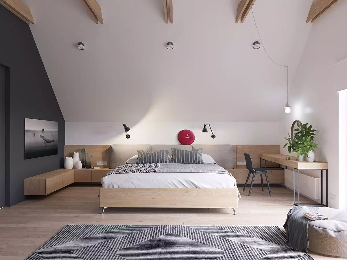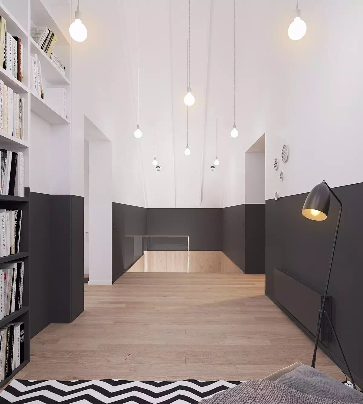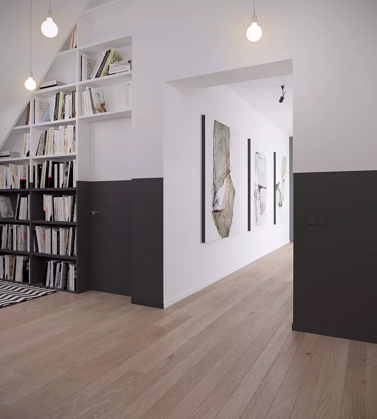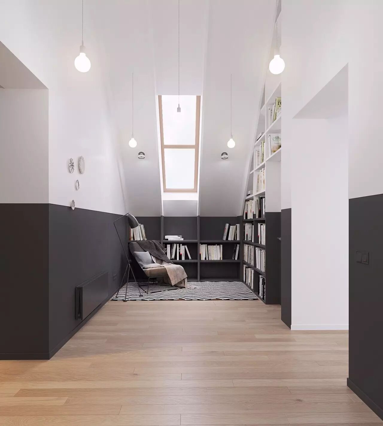 这是一个两层的房子,极简的北欧风,放眼望去也是黑白配合木质的主色,但却丝毫没有减弱生活感。故意隔开的小区域,增加了很多使用功能,比如斜屋顶下的“读书角”,巧妙的利用自然光。每个房间都有别具一格的设计,虽然统一风格,但并不雷同,让生活拒绝单调。