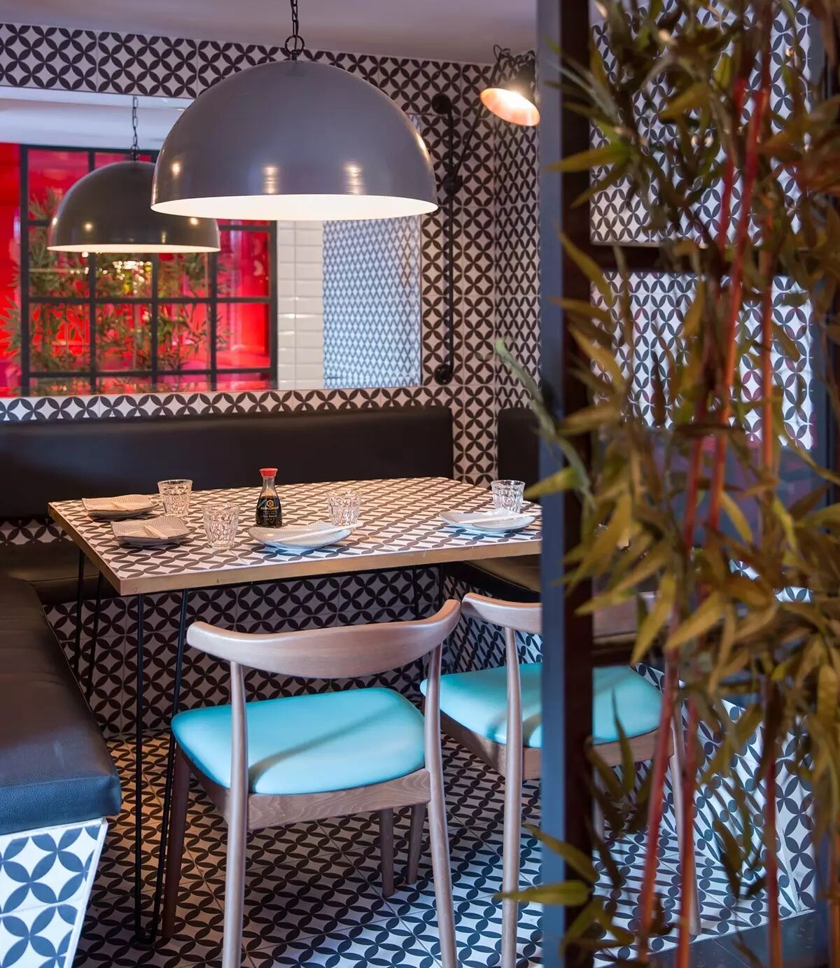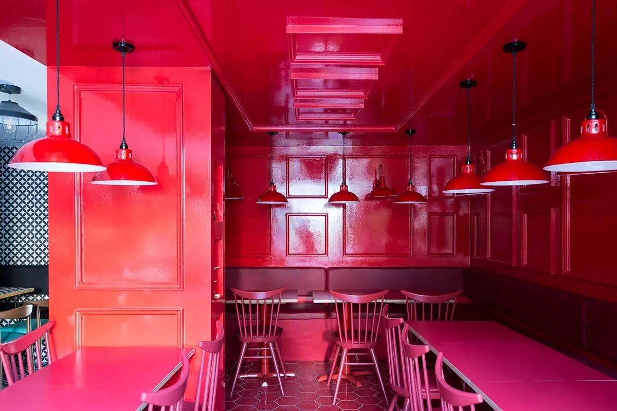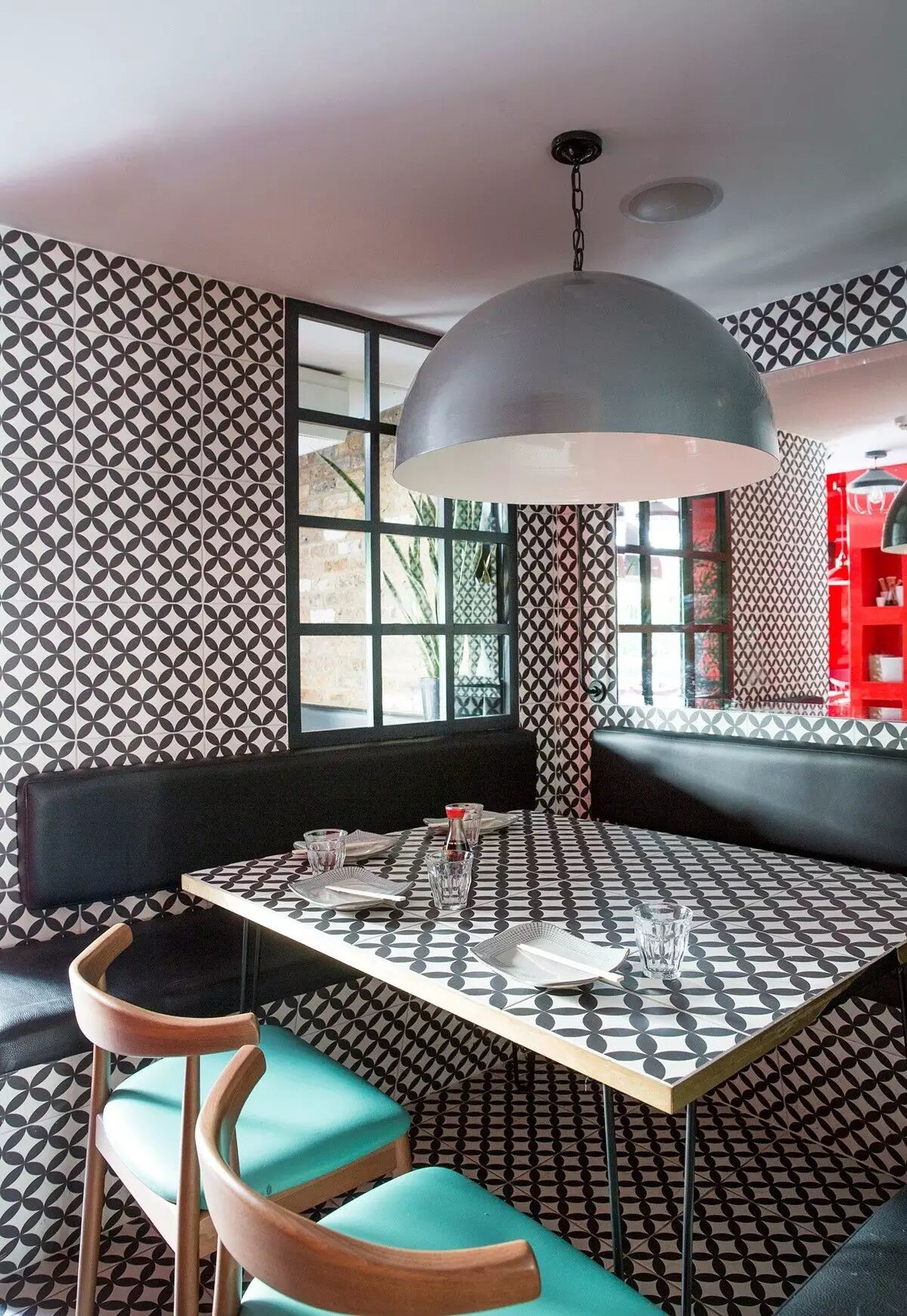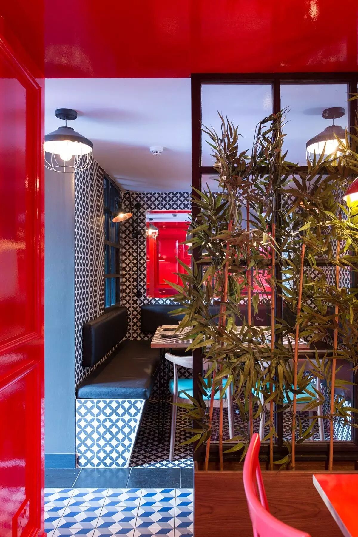 餐厅共有三种不同色彩风格的房间:其一,是用小瓷砖为主要元素,美白的拼接图案给人复古摩登的感觉;通体红色的房间最为抢眼,这里适合热闹的聚会;如果你需要一个较为安静的环境,还有一个房间,这里是不那么亮眼的绿色和蓝色。
