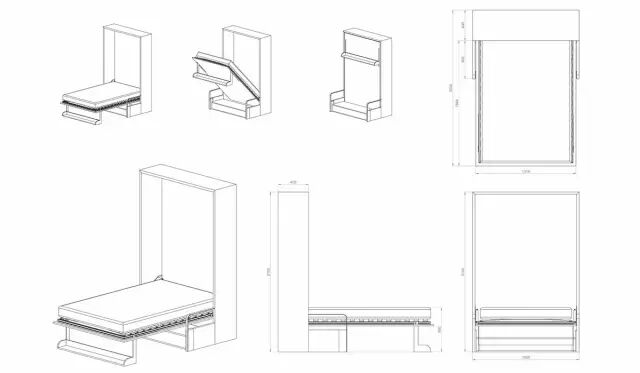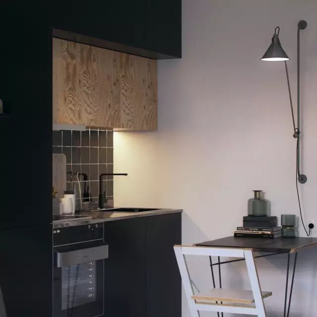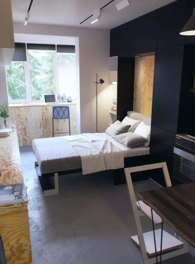 厨房、客厅、卫生间一应俱全,床隐藏在墙中。恰当的储物和简洁的家具让空间利用率更高。