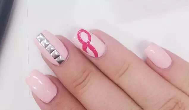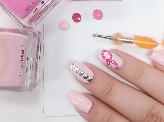 Step 2:在中指指甲上竖着贴上一排银色铆钉,让指甲粉嫩甜蜜中带着点帅气;在无名指上斜着画一个玫红色的“8”形。