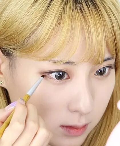 Step 3:眼线刷沾取深棕色眼线膏沿着睫毛根部画一条眼线,眼线画到眼尾时颜色要变得淡一些。