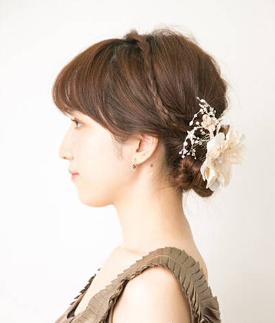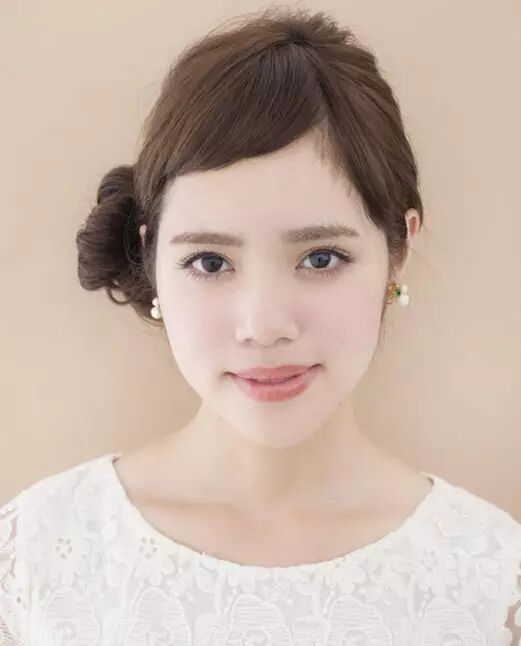 这款盘发拥有的斜刘海能够使得你白皙饱满的额头显露无疑,配合着你那甜美精致的脸蛋,绝对让你优雅气质大增。造型中,将盘发的花苞头置于侧边,又会显得俏皮而清爽。