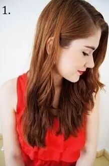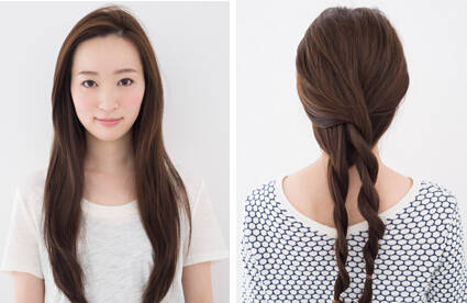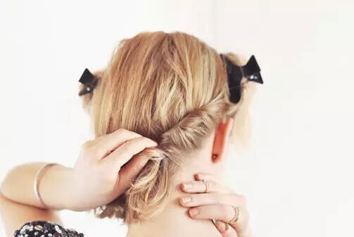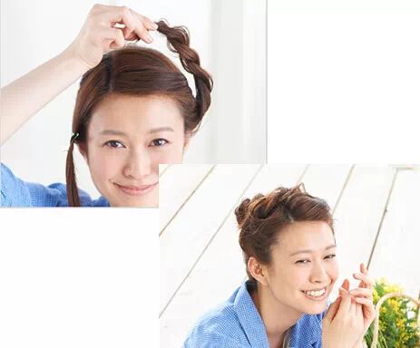 STEP3:扭转好的头发拉倒后面固定在发髻的侧边。另外一边的刘海也用同样的方法扭转后固定。STEP4:喷上定型产品,这款清爽的发型就完成了。