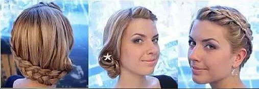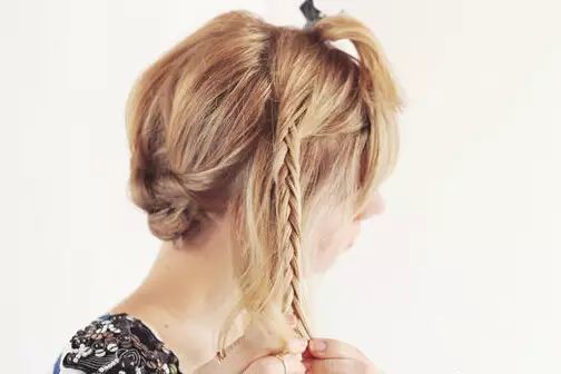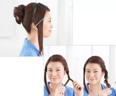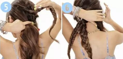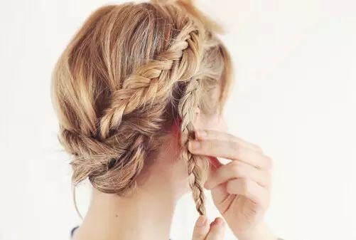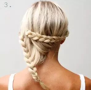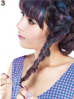 STEP7:较少的那一股头发也编成三股辫之后拉松。将这根发辫贴着上面的三股辫固定在脑后。