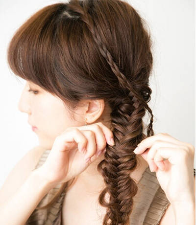 STEP3:编发到耳朵位置的时候,加入左侧的头发继续编发,直到左侧剩余的头发都编到了麻花辫中为止,编至发尾,用皮筋绑起来。STEP4:轻轻拉扯辫子,使其自然一些。