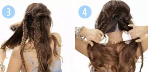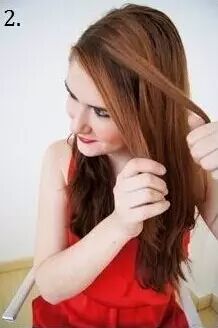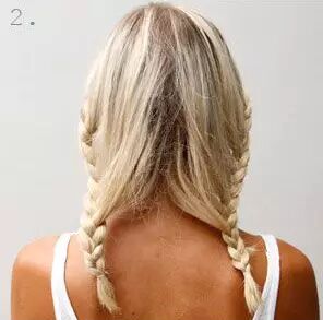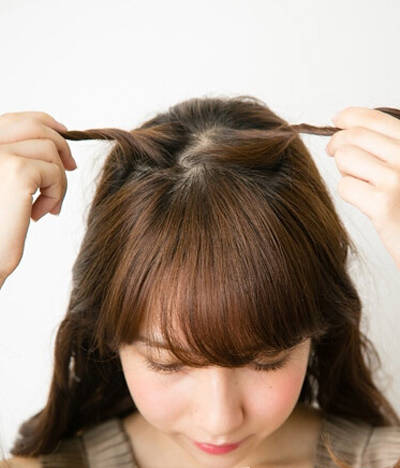 Step 2:将头发中分,从一侧取两小束头发,两束头发交叉打一个活结。