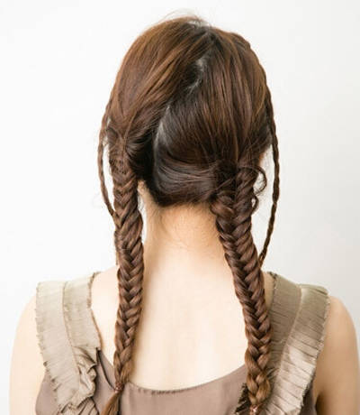 Step6:编至发尾,用皮筋扎好。这样就编出了两条平行的麻花辫。