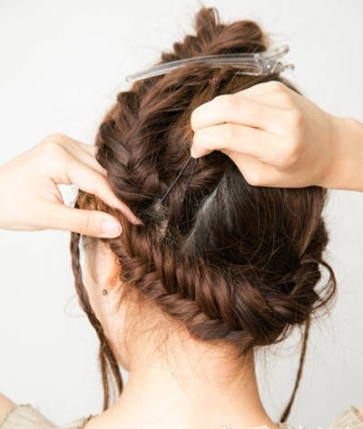 Step7:将编好的麻花辫发尾往里翻折,并用发夹固定好。