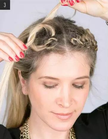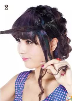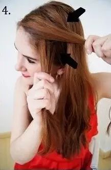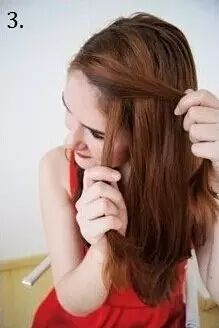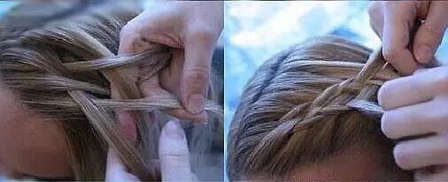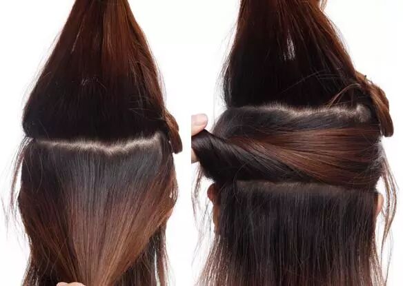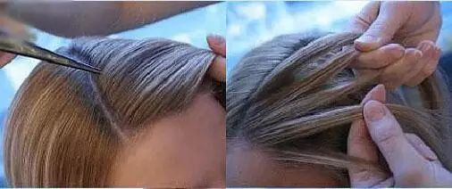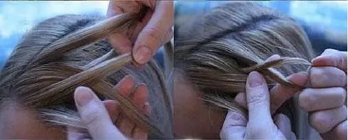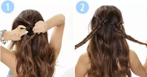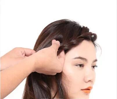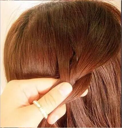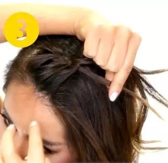 Step5:取最上层的头发,平均分成3股,取左右两边的发束进行扭转。