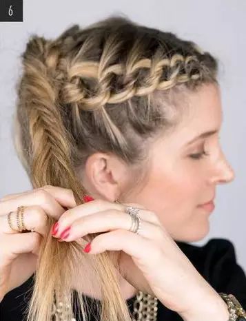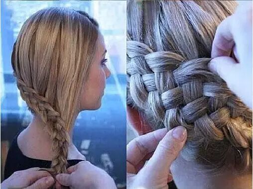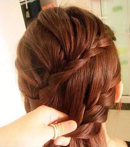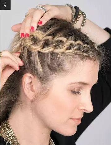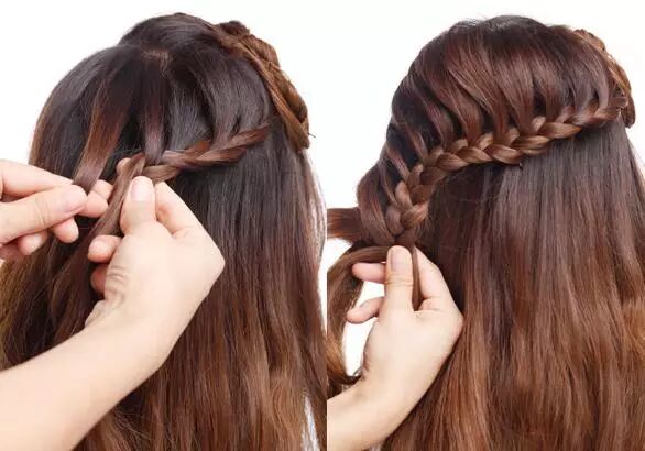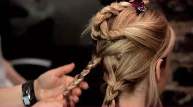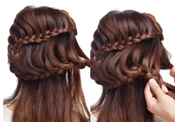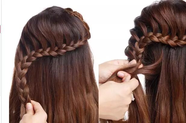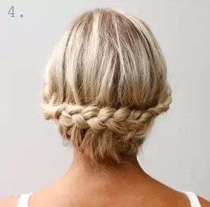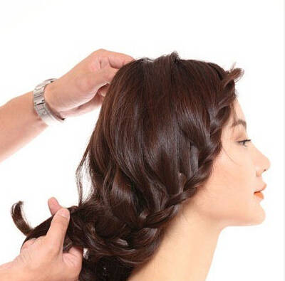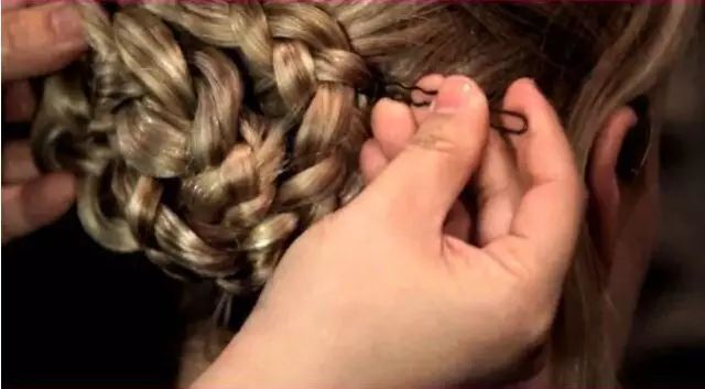 Step 4:一直编到脑后位置并用发卡固定,另一边也是如此,两边合在一起编织成一个皇冠的样子。