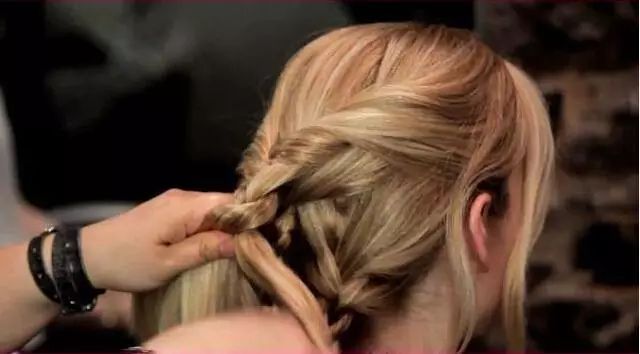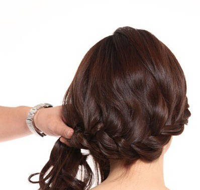 Step6:扭转至后脑勺的位置后,取剩下的发束进行三股辫编发。