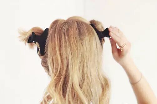 第五步:将两侧的花苞头拉出蝴蝶结效果,并用发夹固定。