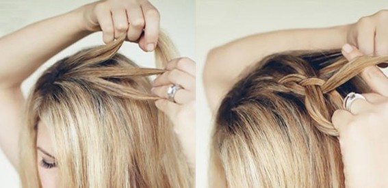 Step2:从右侧耳朵上方开始编发,按三股编编发,编一小节后从头顶取一绺发束加入编发。