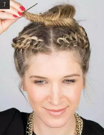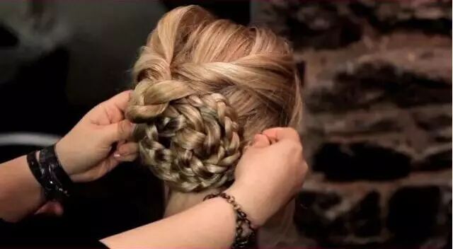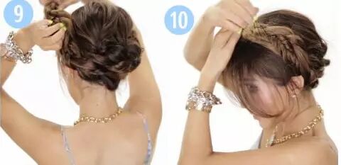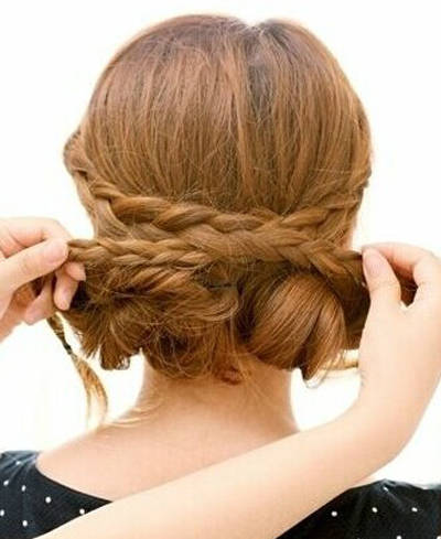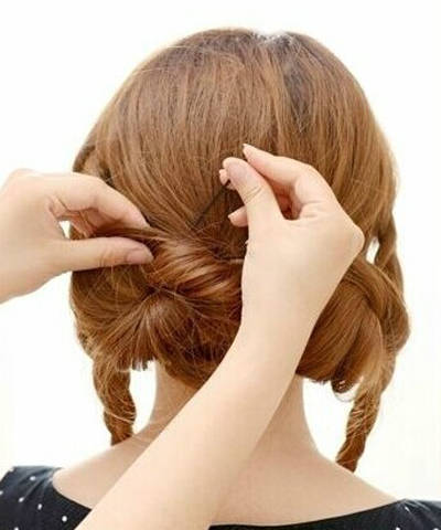 Step8:中间编织好的三股辫按同一个方向盘发,并用发夹固定住。用最下一层编织好的麻花辫环绕,也按照同一个方向盘发,最后也用发夹固定住。