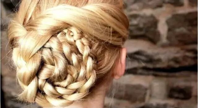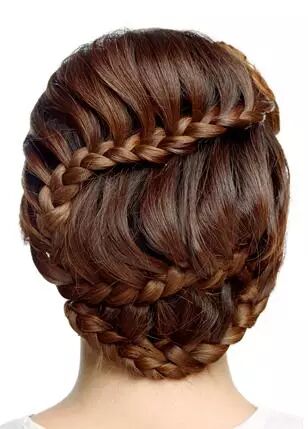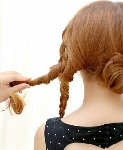 【 40 】步骤4:再将两侧麻花辫在脑后交叉,盖在刚才的盘发上。