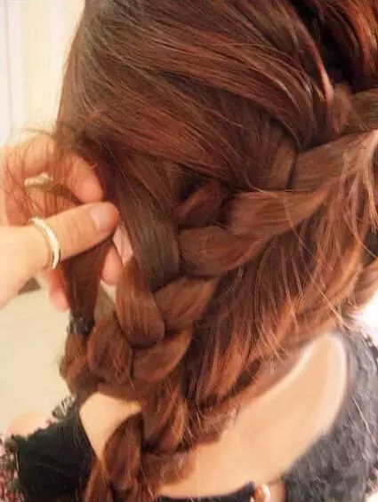 【 22 】Step8:接着每编一节取出手侧一股头发编入进去,左右交叉,就是蝎子辫的编法。