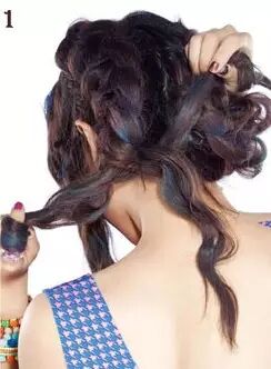 STEP1:如图将头发分成三部分,前面刘海部分头发较少,分成二八分,先用夹子固定。将后面大部分的头发盘成一个较高的松散发髻。STEP2:将前额的刘海较多一面的头发分成两部分扭转,然后用手指拉松。