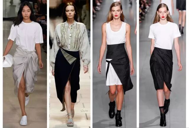 在素色连衣裙外搭不规则的裹身半身裙即可。