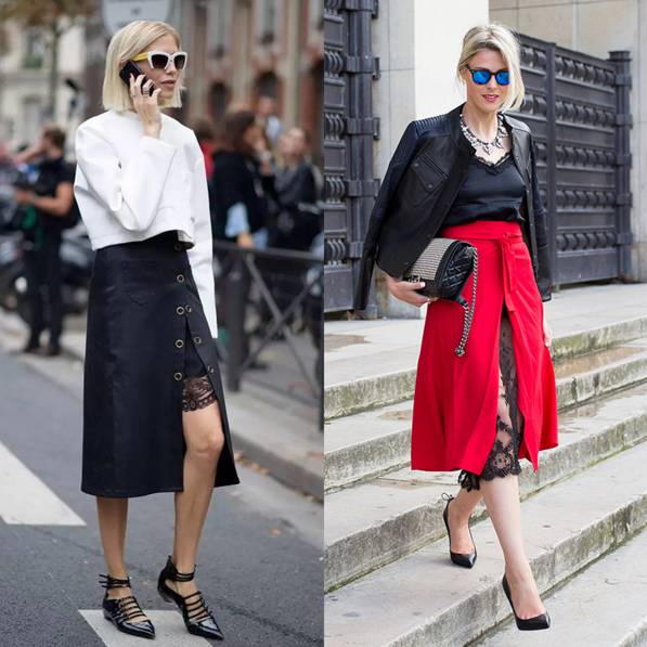 蕾丝裙或薄纱裙穿在里面,外面套穿裹身半裙