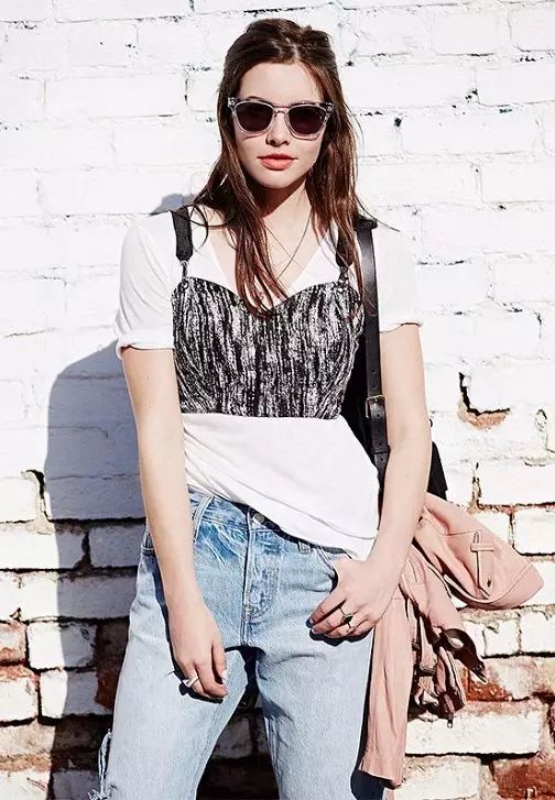 要帅的话就选黑色,Miranda Kerr就用了针织上衣搭黑色毛边牛仔裤,只不过你要把长袖衫换成小背心。