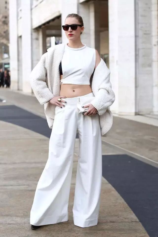相对来说,从里到外清一色白色单品要搭配宽管裤气势才足