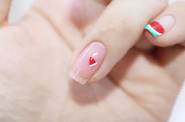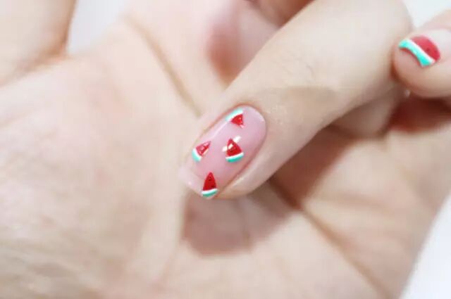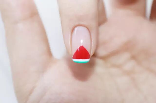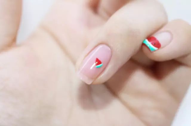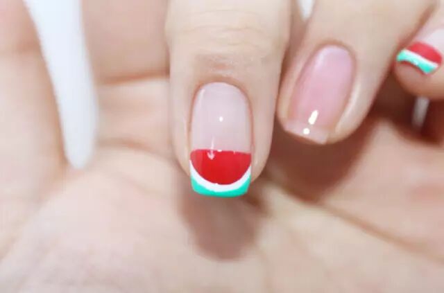 Step 3:接着用薄荷绿色指甲油画一个宽度小于白色指甲油的法式美甲,一瓣西瓜就大致成型了。