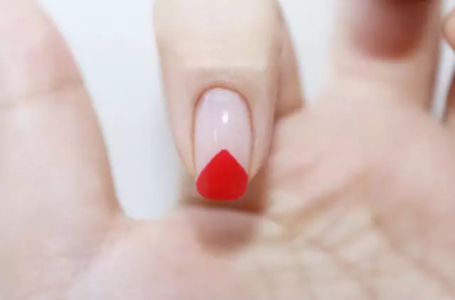 Step 1:在食指指尖用西瓜红色指甲油涂出一个如图尖尖的形状。