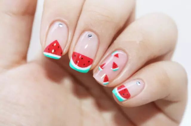 Step 12:在食指、中指、小拇指指根贴上水钻,然后在表面涂一层透明顶油。这简直就是不同切法的西瓜大集合!