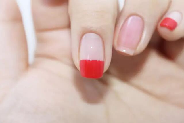 Step 4:在中指指甲用西瓜红色指甲油涂一个指甲1/3长度的法式美甲。