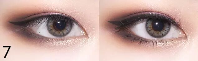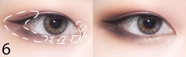 Step 6:眼头和下眼皮靠近内眼角的半段用香槟色珠光眼影提亮;上眼尾和下眼皮后半段用深棕色眼影晕染。