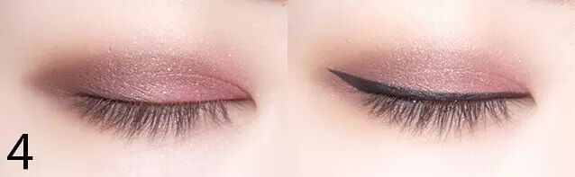 Step 4:用黑色眼线液笔从眼头开始沿着睫毛根部画一条眼线,眼线在眼尾拉长上扬。