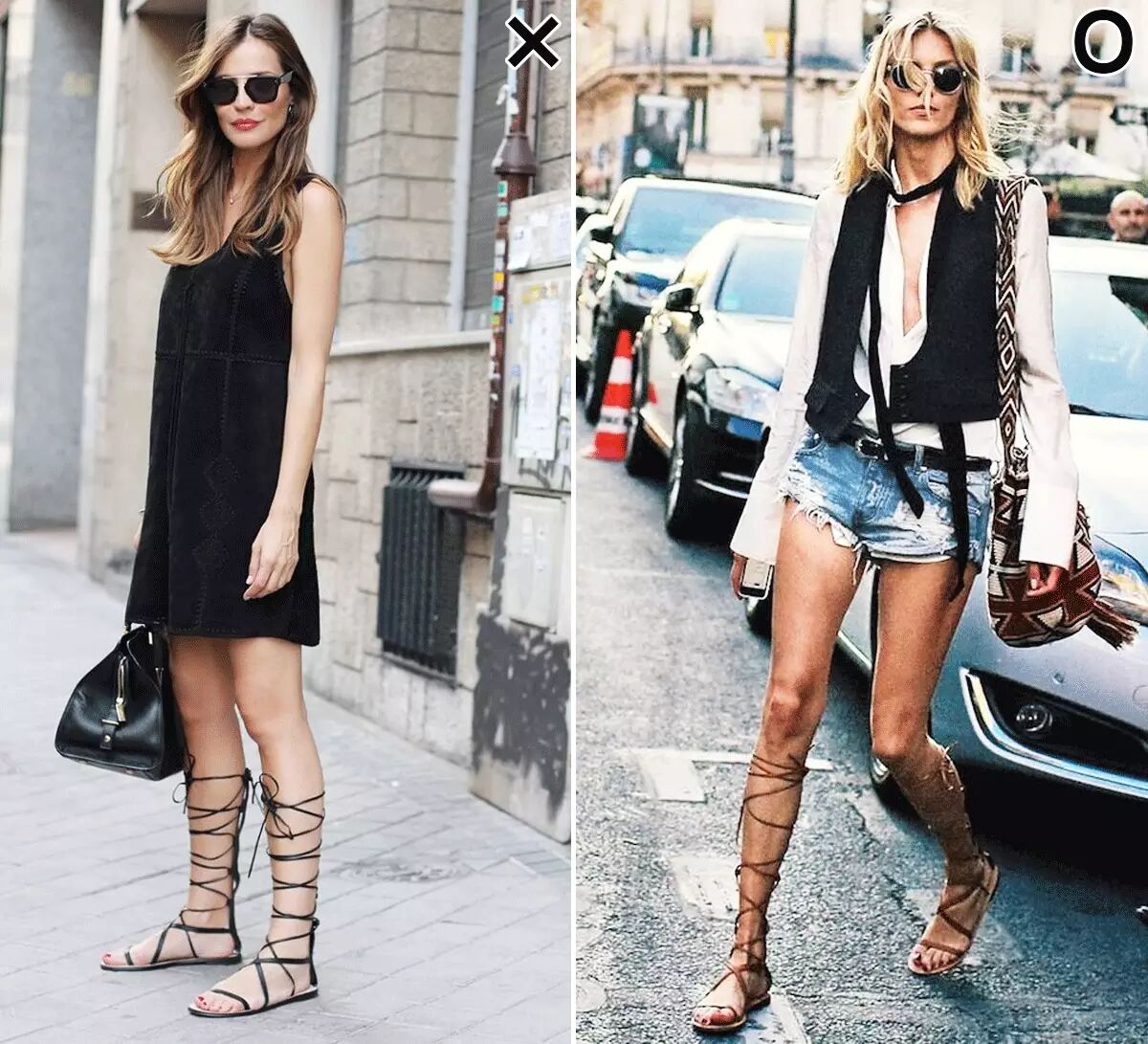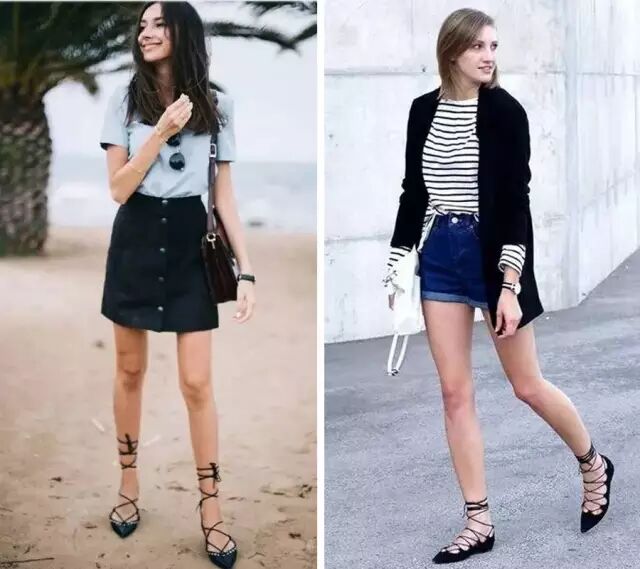 一般人看到超长绑带鞋都会退避三尺,觉得太夸张不敢尝试。▼可是我要说,长款真的比短款绑带显瘦!像左图这样,绑带很"平"没有变化,而且绑到小腿肚儿位置是完全错误的示范!大家不要学!▼正确的穿法是:1. 参差不齐的绑到膝盖处 2.裤子越短越好,露出大面积的腿部 3.像右图这样(腿型越好越显细长)
