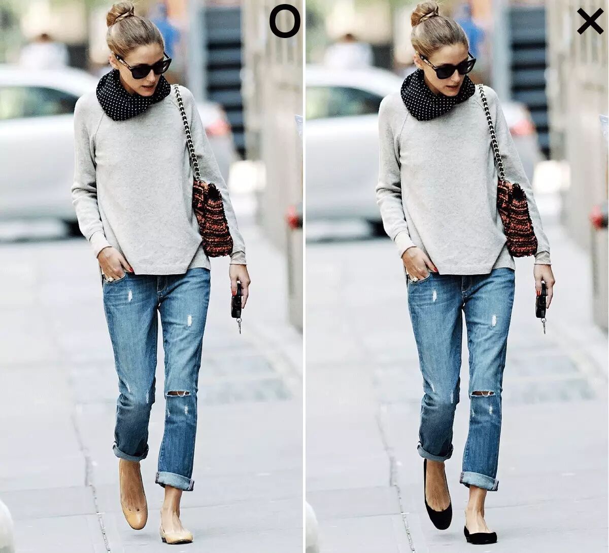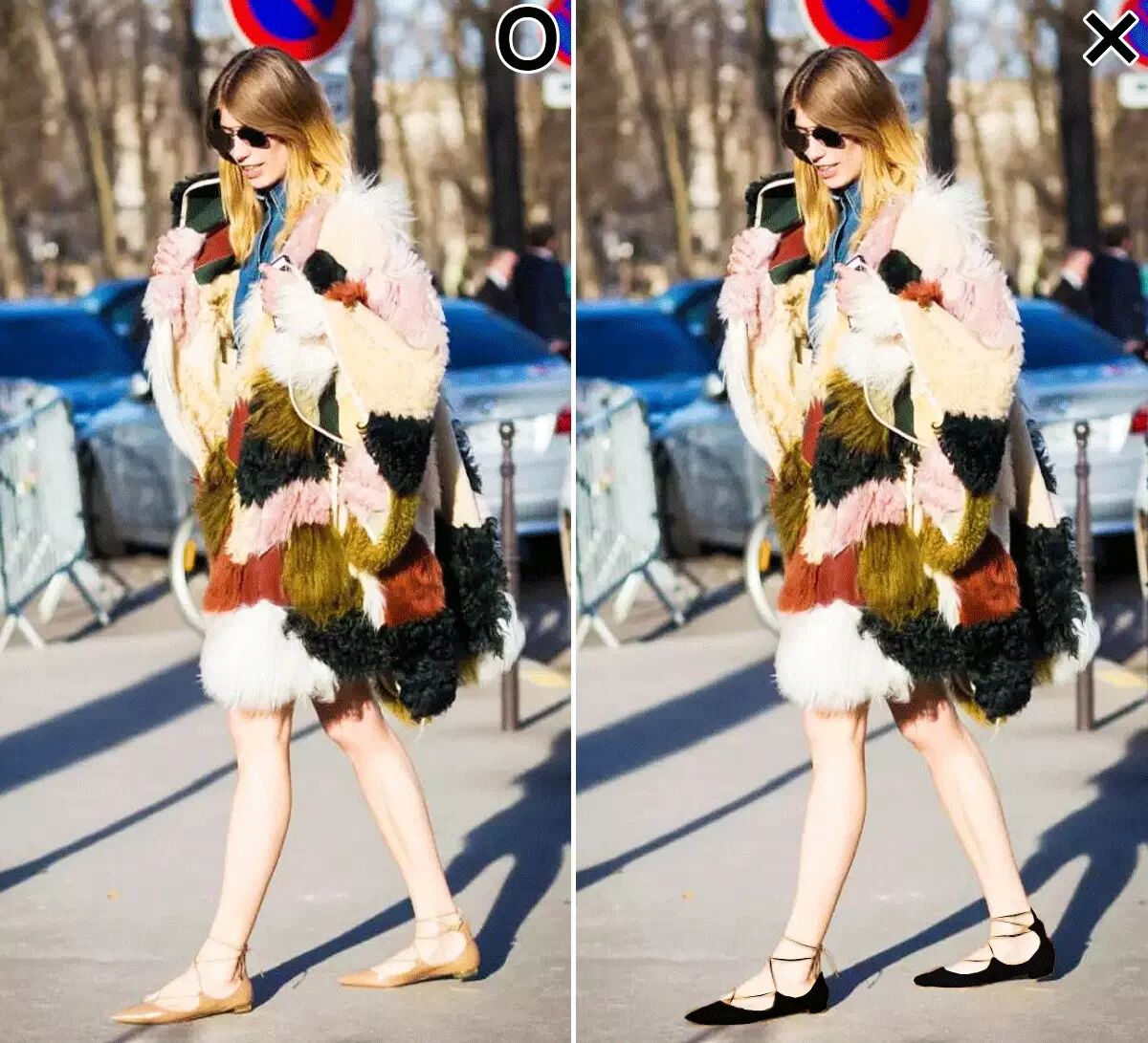 我把OP的裸色鞋子P成了黑色,这样深浅两者对比显而易见了吧~▼