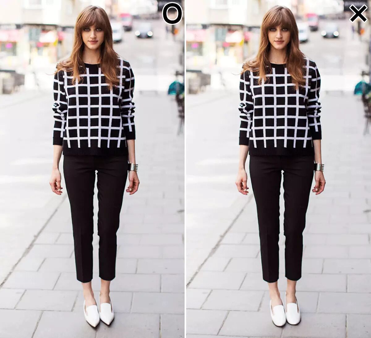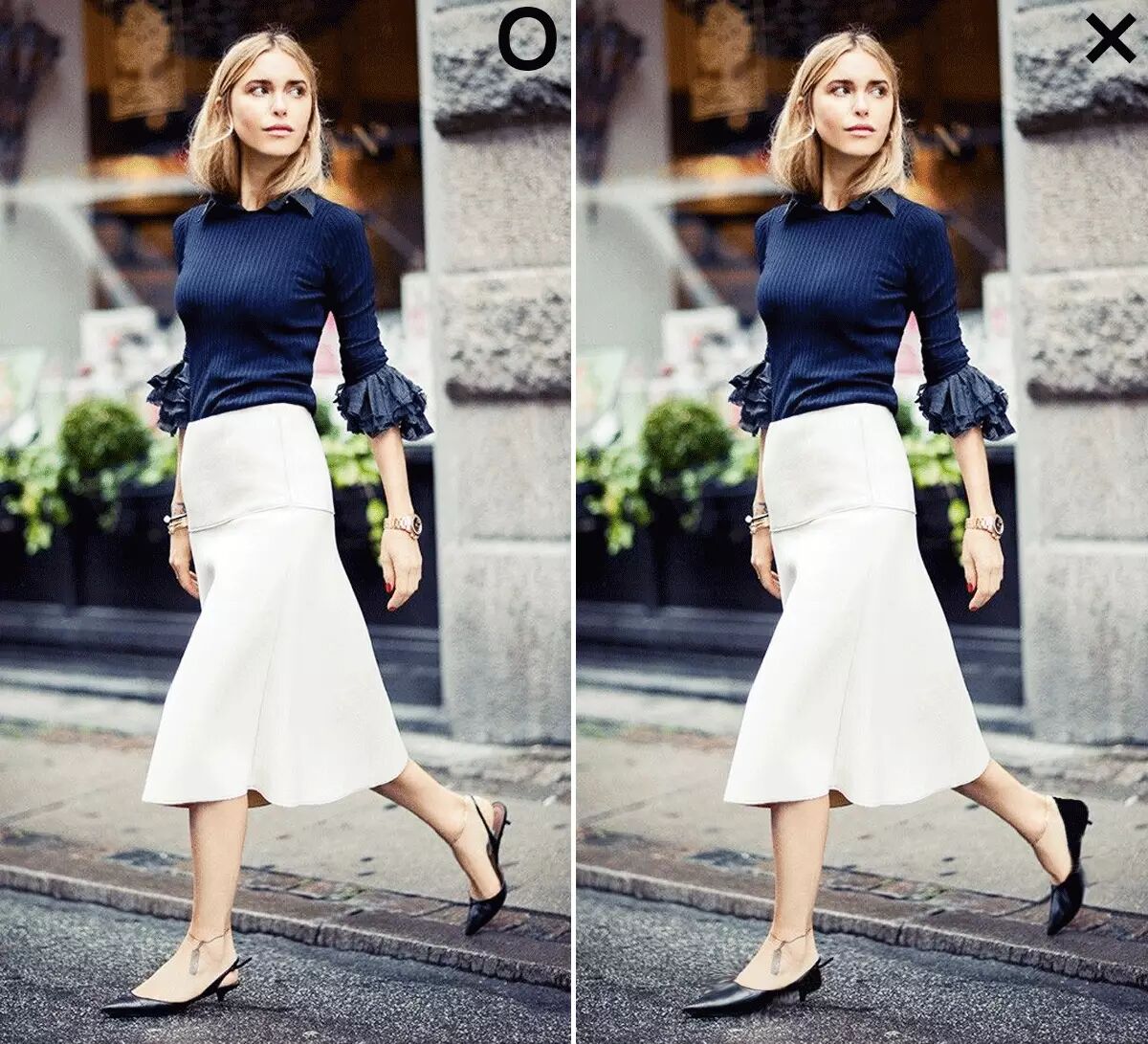 这两张图能从正面非常明显的看出,鞋头变圆后显得双腿短了一截,气场也减少许多。▼