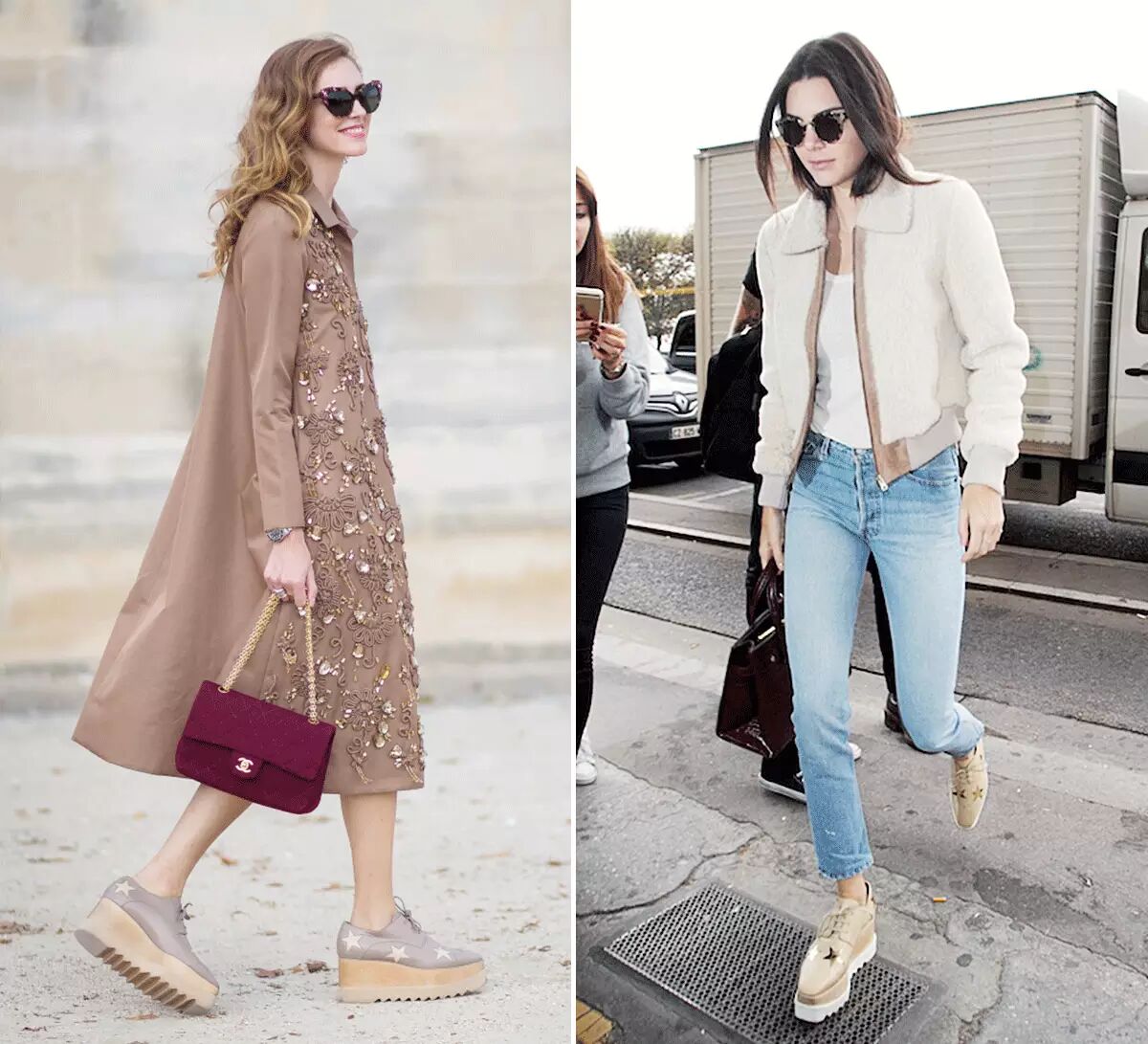 L: Adidas Stan Smith / R: Adidas Super Star3)厚底鞋厚底鞋是犯规的平底鞋款式,水平增加了鞋底的厚度,所以也算作是平底的。(勉强算是吧)本身鞋底就增加了腿的长度,会显得脚踝超细,再加上尖头和裸色!Stella McCartney能这么火不是没有原因的~▼