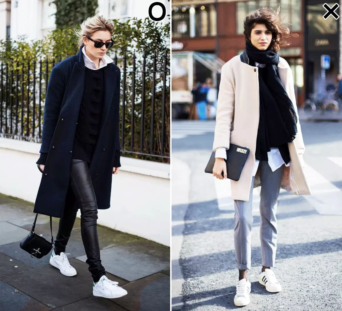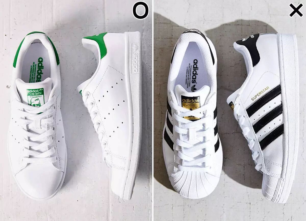 2)Adidas Stan SmithStan Smith已经是大家熟到不能再熟的小白鞋了~和他出生同门先出道的Super Star系列同作为爆款小白鞋,为啥输给了Stan Smith(左图)呢?因为Stan Smith鞋型更窄上脚更好看呀!而Super Star(右图)的经典贝壳头是圆圆的,显脚小。(前面我说过什么来着,脚大才显腿细)▼