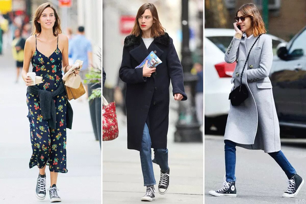 钟小姐也是一年四季爱穿帆布鞋,但我的建议是腿型不够好的话,穿裤子配高帮,露腿时配低帮,单穿高帮会遮脚踝显小腿粗哦~▼
