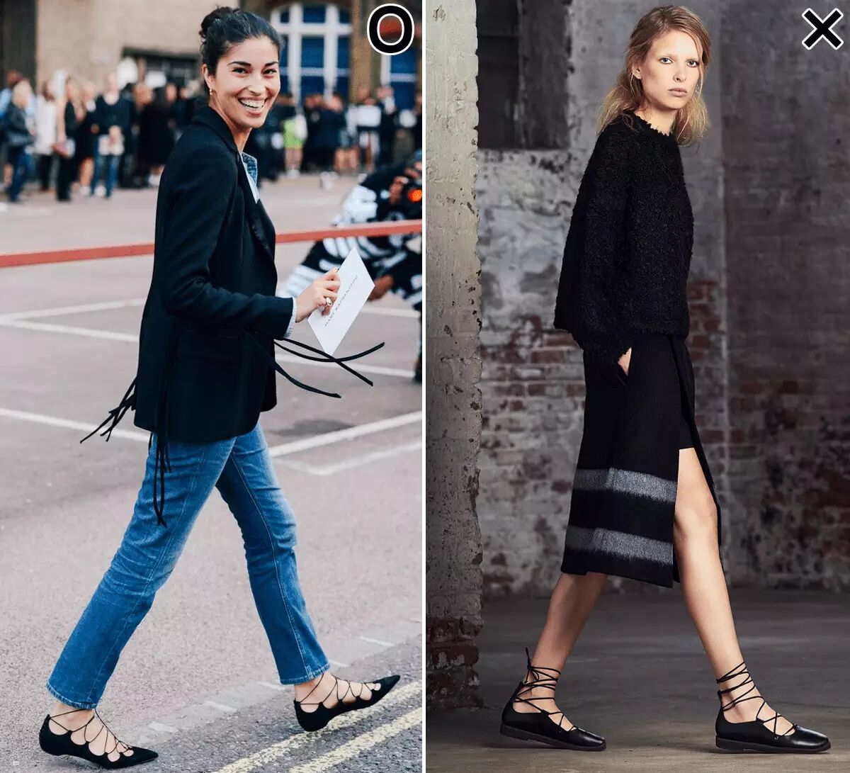 绑到脚踝处的绑带鞋最容易被大家接受,但是深色绑带会将脚和腿从视觉上分割开来,脚踝是细了但会显得腿短。▼
