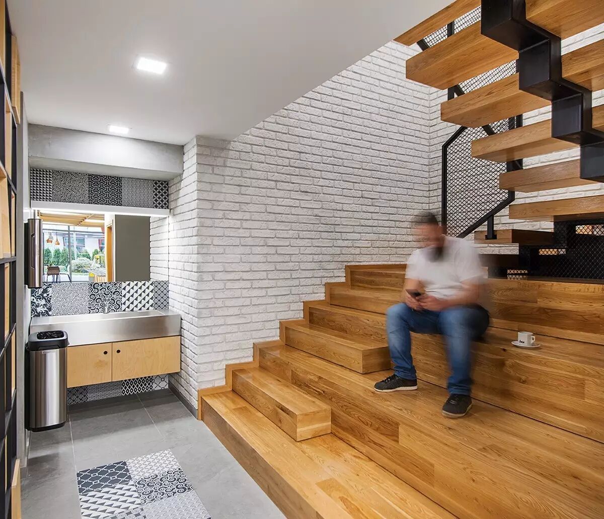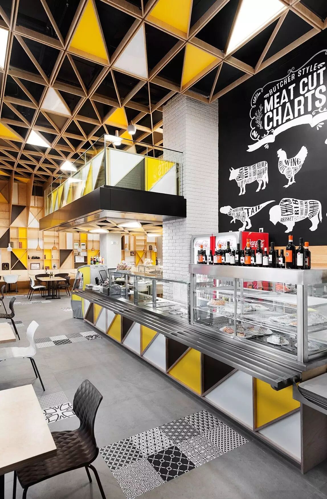 一改以往酒馆给人留下的昏暗暮气,采用黑白黄的配色打造出时尚年轻的氛围。分成两层,采用同样的设计思路,简约风格带有一些硬朗的工业感。连接两层的楼梯下,也可以坐下来打打电话,免去一些相互的骚扰。餐厅除了提供酒以外,还有以肉为主的菜肴,从墙上的插画就能看出来。