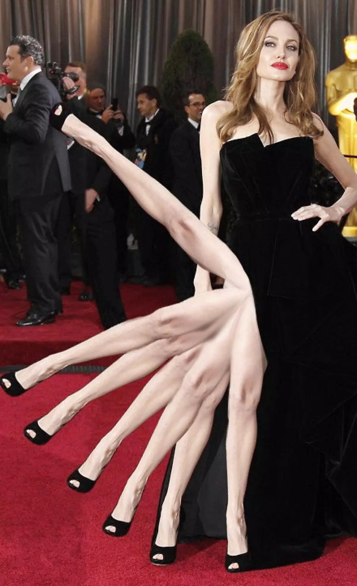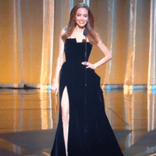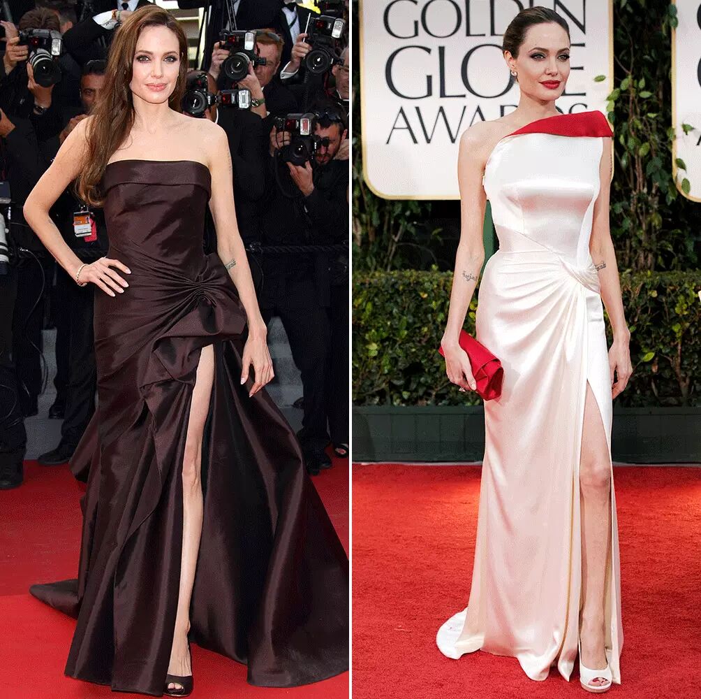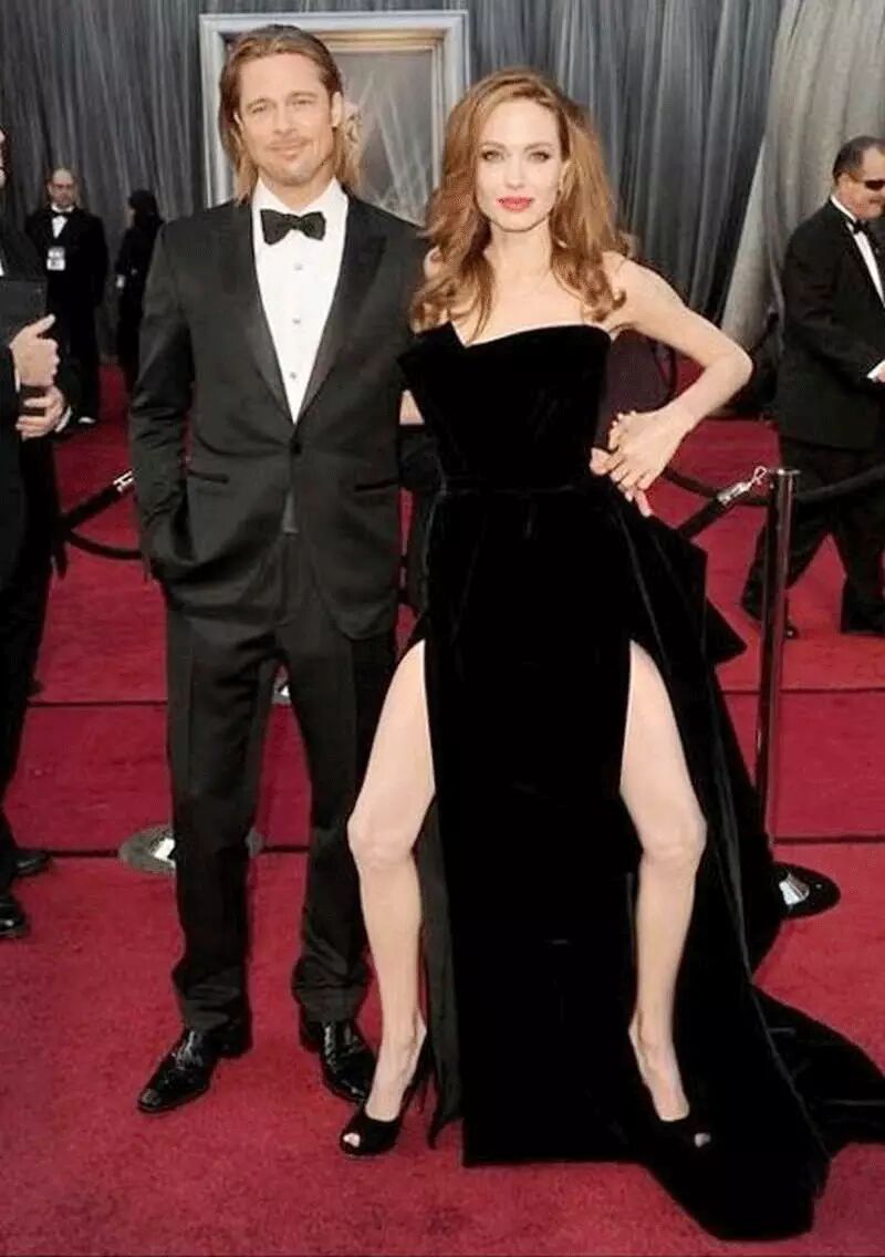 这个经典pose产自2012年奥斯卡红毯,Angelina Jolie穿着Versace黑色高叉裙,顺便把自己的右腿也一个马步向前岔了出来,比起公开露腿,显得更性感更霸气更有惊喜。