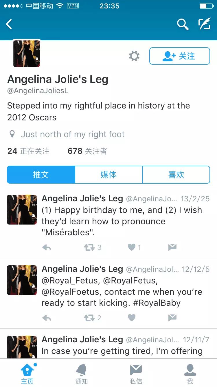并且这条腿还有自己的 Twitter账号“Angelina Jolie’s leg”,当然现在已经没有在更新,最近的一条是在13年,祝自己一岁生日快乐……