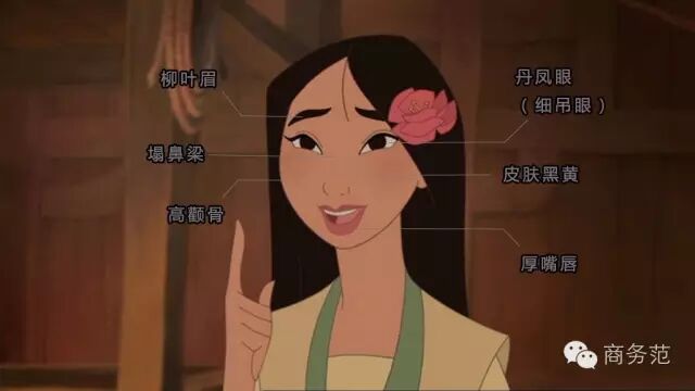 显然,迪士尼的花木兰是老外心目中中国美女的集大成者:柳叶眉(高眉弓)、丹(细)凤(吊)眼、塌鼻梁、高颧骨、厚嘴唇、皮肤黑黄_(:з」∠)_