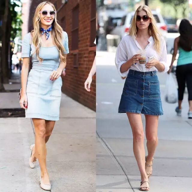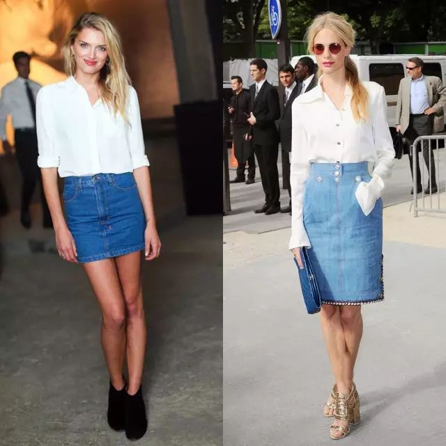 白色衬衣配上蓝色牛仔裙,选择雪纺质地的上衣会让整体look看上去更清爽喔~