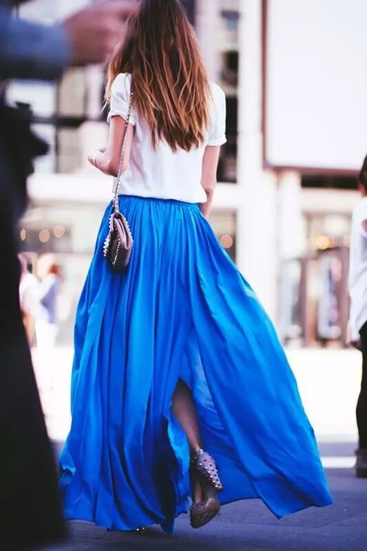 白色字母T+宝蓝流苏皮裙,再配上baby blue色尖头鞋,为酷暑夏日带来一抹清凉~