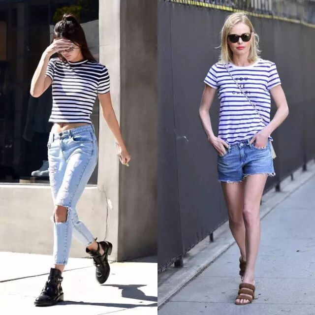 想要打造蓝白look,还可以选择蓝白条纹的海魂衫,经典又百搭。