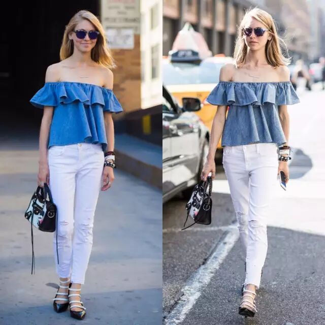 牛仔布料的露肩上衣配上白色破洞牛仔裤,清爽又耐看。