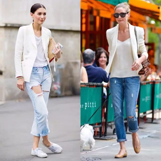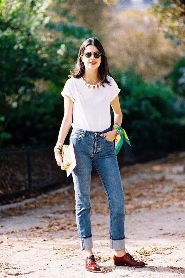 最简单的自然是白T+牛仔裤,配上小白鞋或是凉鞋看起来都十分清爽。