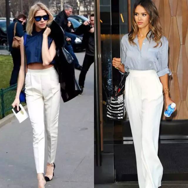 将蓝白换个方向,蓝色上衣配白色裤子,下面两种示范也十分适合办公室女郎的夏日穿着喔。